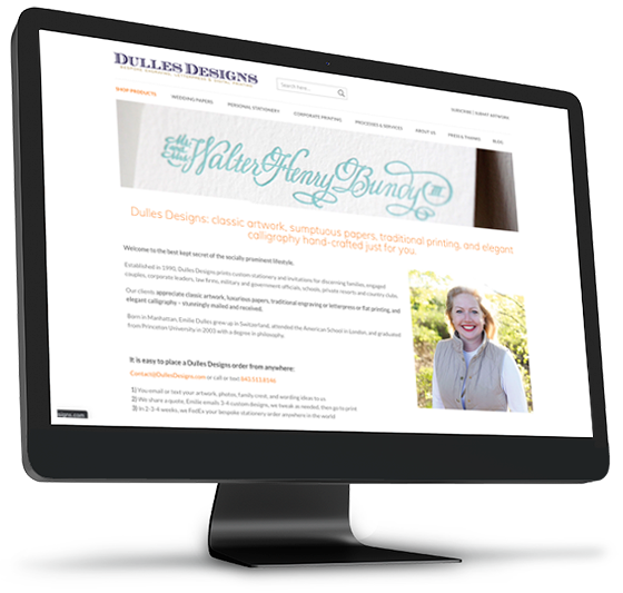 We worked closely with Dulles Designs and their team in order to create a website that provided fantastic imagery of the work they have done along with the ability for new customers to have the experience of ordering their own art work from Emilie in a unique way that allowed them to customize and build anything from their own wedding invitations to save the date cards to custom business cards and just about anything else related to design and print with bespoke custom designs.